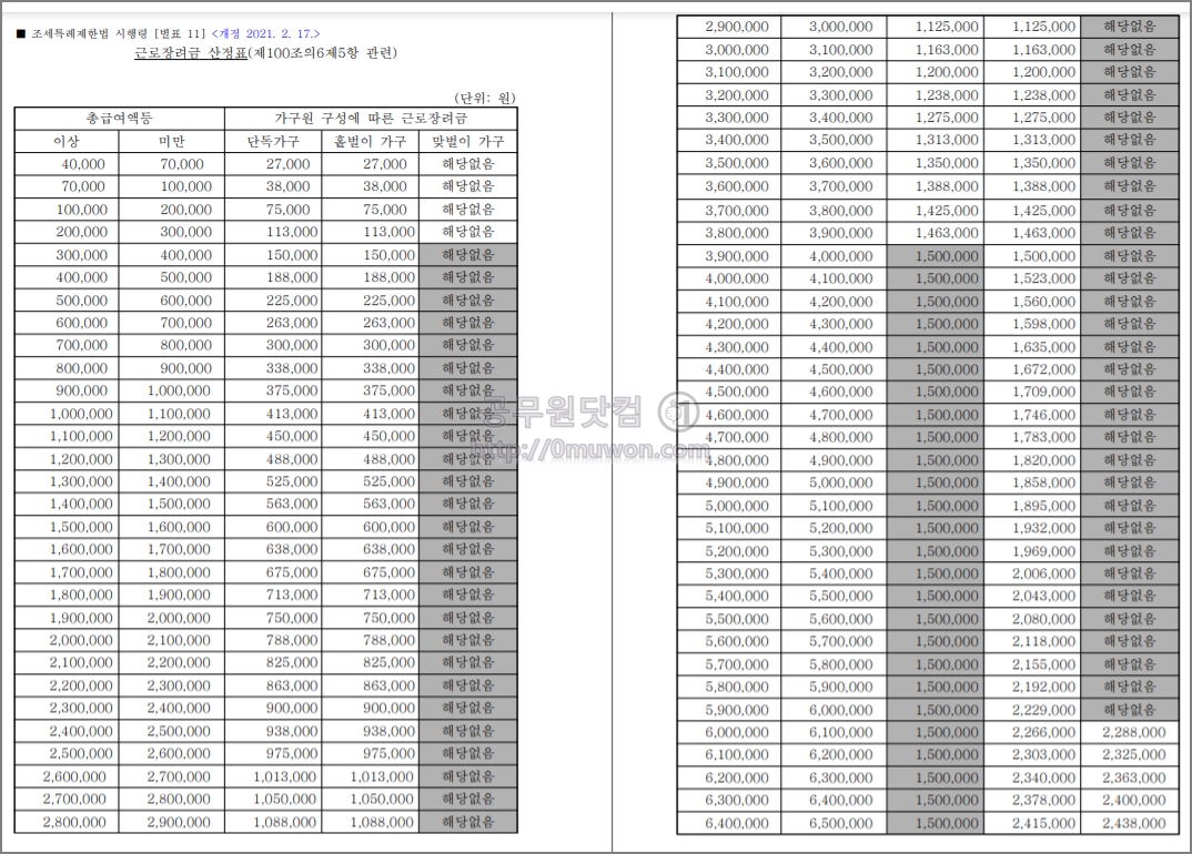 계산식은 계산편의를 위한 것이며, 실제 지급액은 근로장려금 산정표를 기준으로 합니다. 2021년도 근로장려금 산정표입니다. 2021년 2월 17일 변경되었습니다.. 신청기간에 근로장려금의 신청을 하지 않은 경우에는 신청기간 종료일 다음날부터 6개월 이내에 신청을 할수 있습니다.다만, 이 경우에는 산정표의 90%만 지급을 합니다.