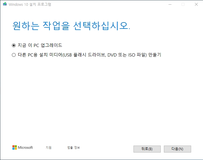 ▼ 원하는 작업을 선택합니다. 다른 PC용 설치 미디어를 만들 수도 있습니다. 지금 이 PC 업그레이드를 선택합니다.