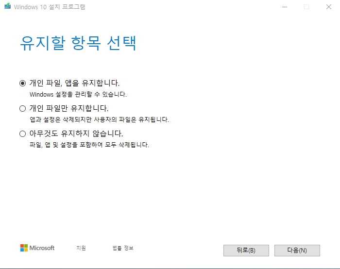 ▼ 유지할 항목을 선택하는 경우입니다. 개인 파일, 앱을 모두 유지할 수도 있습니다. 개인 파일만 유지할 수도 있습니다. 파일, 앱 및 설정을 포함하여 모두 삭제하려면 아무것도 유지하지 않습니다를 선택하면 됩니다.