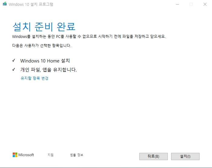 ▼ 이제 설치 준비가 완료 되었습니다. windows 10 설치, 개인 파일, 앱을 유지합니다에 체크를 확인하세요.