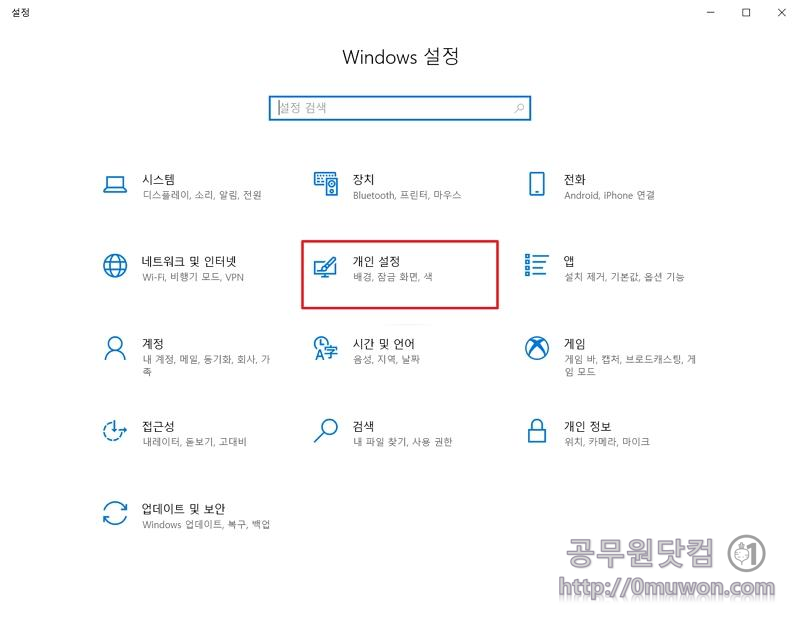 ▼ 윈도우 설정에서 '개인 설정'을 클릭합니다. 배경, 잠금 화면, 색 등이 설정 가능합니다.