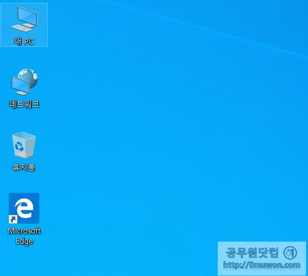 윈도우 10이 설치된 후 바탕화면 모습입니다. 휴지통외에는 다른 것들이 없습니다. 내 PC 메뉴는 제일 많이 사용하는 앱입니다. 내 PC부터 경로를 지정하기기 때문에 쉽게 사용할 수 있는 곳에 있어야 편합니다.