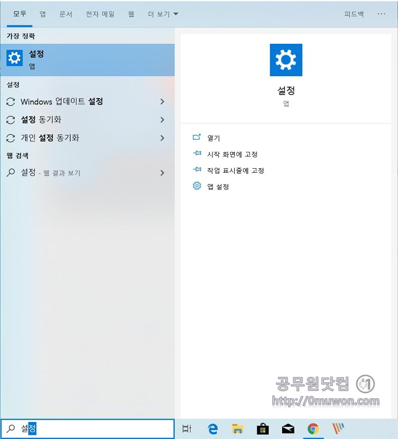 ▼ 검색창에서 '설정' 을 검색 후 클릭합니다.