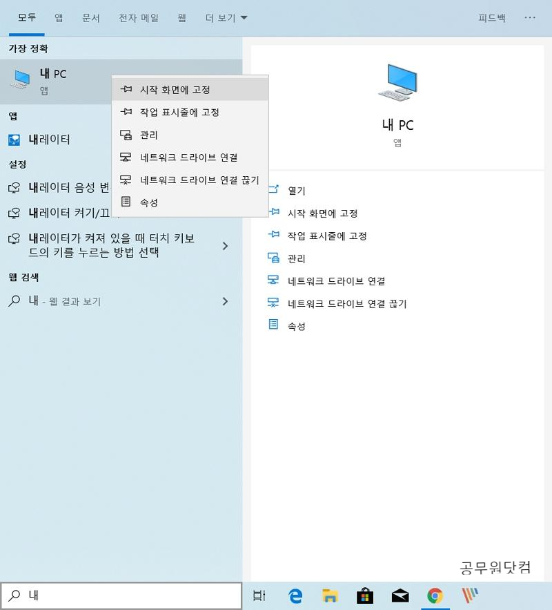 우선 첫번째로, 내 PC 앱을 시작화면에 고정하거나 작업표시줄에 고정하는 방법입니다. 검색창에 '내 PC'를 검색하면 내 PC 메뉴가 나옵니다. 오른쪽 마우스를 클릭하면 '시작 화면에 고정', '작업 표시줄에 고정' 이 나옵니다. 2가지 중 편한 걸 선택하면 됩니다. 모두 선택을 해도 상관은 없습니다.