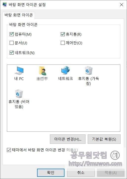 ▼ 바탕화면 아이콘 설정에서 바탕화면에 꺼내고 싶은 것을 선택하면 됩니다. 내컴퓨터, 휴지통, 문서, 제어판, 네트워크를 선택할 수 있습니다.