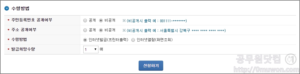 ▼ 수령방법을 선택합니다. 주민등록번호 공개여부, 주소 공개여부, 수령방법, 발급 희망수량을 선택합니다.