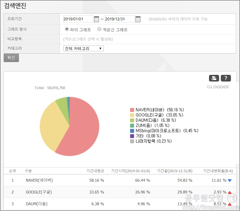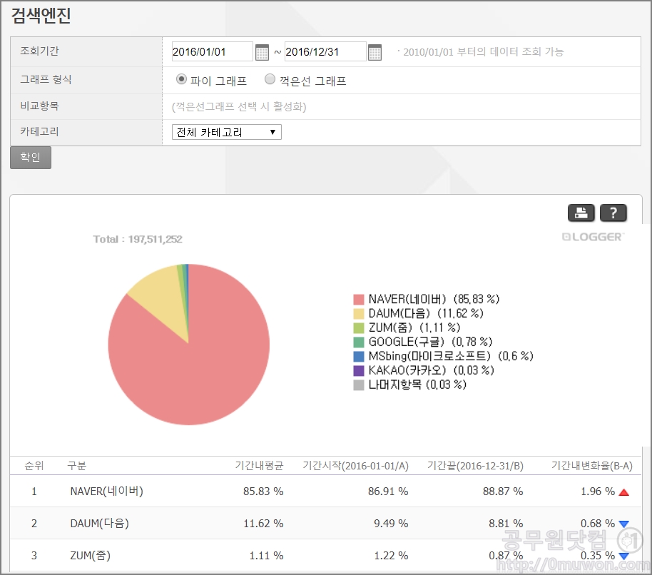 검색사이트의 점유율은 사이트를 운영하는 분들에게는 매우 중요한 요소입니다. 현재 사이트의 검색 유입을 볼때 검색사이트 점유율과 비례해야 합니다. 네이버, 구글, 다음 순이어야 합니다. 사이트 운영 시 참고하시기 바랍니다. 검색사이트 점유율 자료는 인터넷트랜드에서 참고하였습니다.