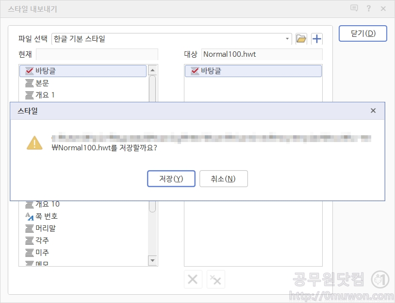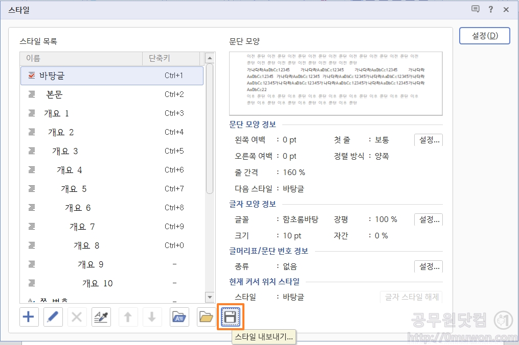 서식 > 스타일 > 스타일 내보내기 > 파일 선택 > Normal(한글기본 스타일) > 바탕글 제외하고 모두 삭제 > 닫기 > 저장으로 스타일을 정리합니다. 한글 2010, 2018 등 버전에 따라 조금 차이는 있을 수 있습니다만, 방법은 동일합니다.