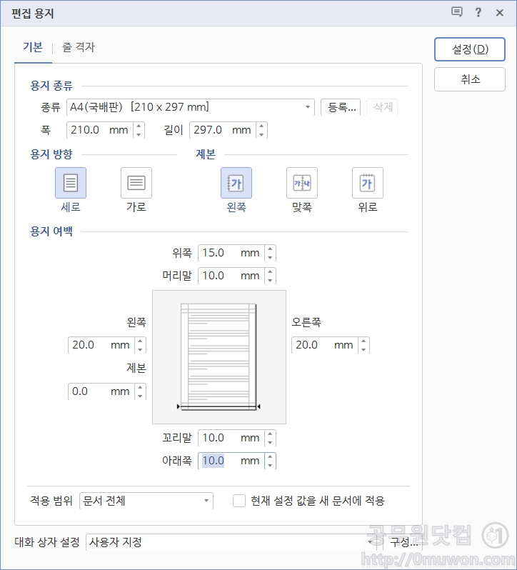 도구 > 파일 > 편집 용지 > 기본 에서 용지여백을 조정합니다. A4 기준입니다. 위쪽여백 15, 머리말 10, 왼쪽 20, 오른쪽 20, 꼬리말 10, 아래쪽 10 입니다. 아래쪽 여백을 15를 주어도 상관은 없습니다. 이게 정답은 아닙니다만, 일반적으로 많이 사용합니다. 기관마다 정해진 편집 용지 설정이 있다면 그걸 사용하면 됩니다.