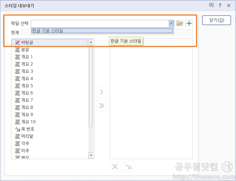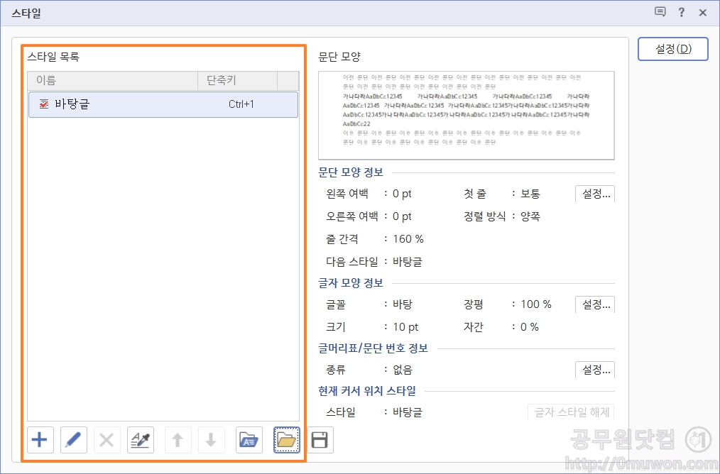스타일이 바탕글을 제외하고 모두 삭제 되었습니다. 저장을 완료하였는데도 스타일 목록이 기존과 같다면 하단의 폴더모양을 클릭하여 스타일을 가져옵니다. 가져오기 화면에서 한글 기본 스타일을 선택합니다.