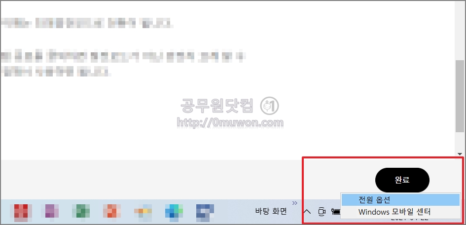 1. 윈도우 화면 우측 하단에서 배터리 모양 아이콘에서 마우스 우클릭을 합니다. '전원 옵션'을 선택합니다.