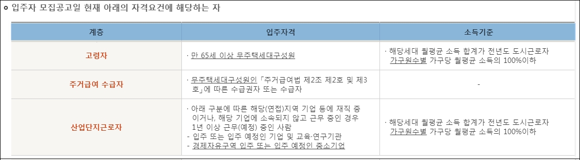 입주자격 및 소득기준은 자주 변경될 수 있습니다. 꼭 입주자모집 공고문을 확인해 보시기 바랍니다.