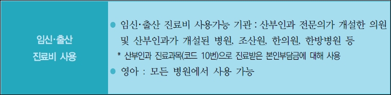 임신, 출산과 관련된 처방에 따른 약제 및 치료재료 구입에 드는 비용에도 사용이 가능합니다. 출산전후 산모와 그 산 모의 1세미만 자녀의 건강관리와 관련하여 처방된 약제 및 치료재료 구입에 드는 비용도 포함이 됩니다.