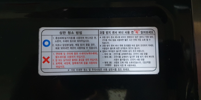 가스레인지를 살펴보니 상판 오른쪽에 '과열 방지 센서 버너 사용 전 꼭 읽어보세요' 문구가 보입니다. 점화 시 부저음이 울리면 조치사항을 알려줍니다. 불을 킬 때 부저음이 나는지도 잘 몰랐습니다.