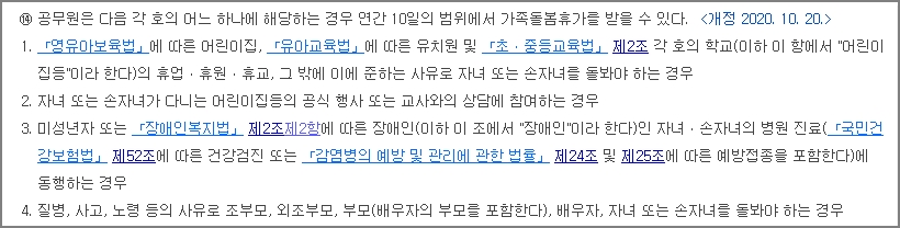 먼저, 기존에 운영하던 자녀돌봄휴가에 대해서 간단히 알아보겠습니다. 자녀에 대해서만 연간 3일가지 자녀돌봄휴가를 사용할 수 있었습니다. 자세한 내용은 이전 글을 참고하시면 됩니다. - 자녀돌봄휴가 공무원 복무규정 개정 사항 질의(해석) 알아보기