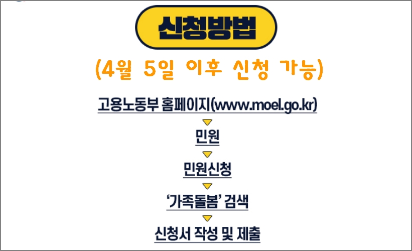 4월 5일 부터 신청이 가능합니다. 고용노동부 홈페이지 > 민원 > 민원신청 > 가족돌봄 검색 > 신청서를 작성 후 제출을 하면 됩니다. 아래에서 자세히 설명하도록 하겠습니다.