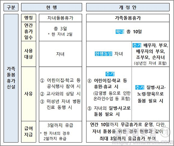 연간 10일까지 무급휴가로 운영이 됩니다. 다만, 자녀 돌봄을 위한 경우 현행과 같이 최대 3일까지 유급휴가가 부여가 됩니다. 즉, 기존 자녀돌봄휴가 연간 2일( 자녀가 2명이상이거나 장애인의 경우 등은 최대 3일)을 제외하곤 무급으로 운영됩니다.