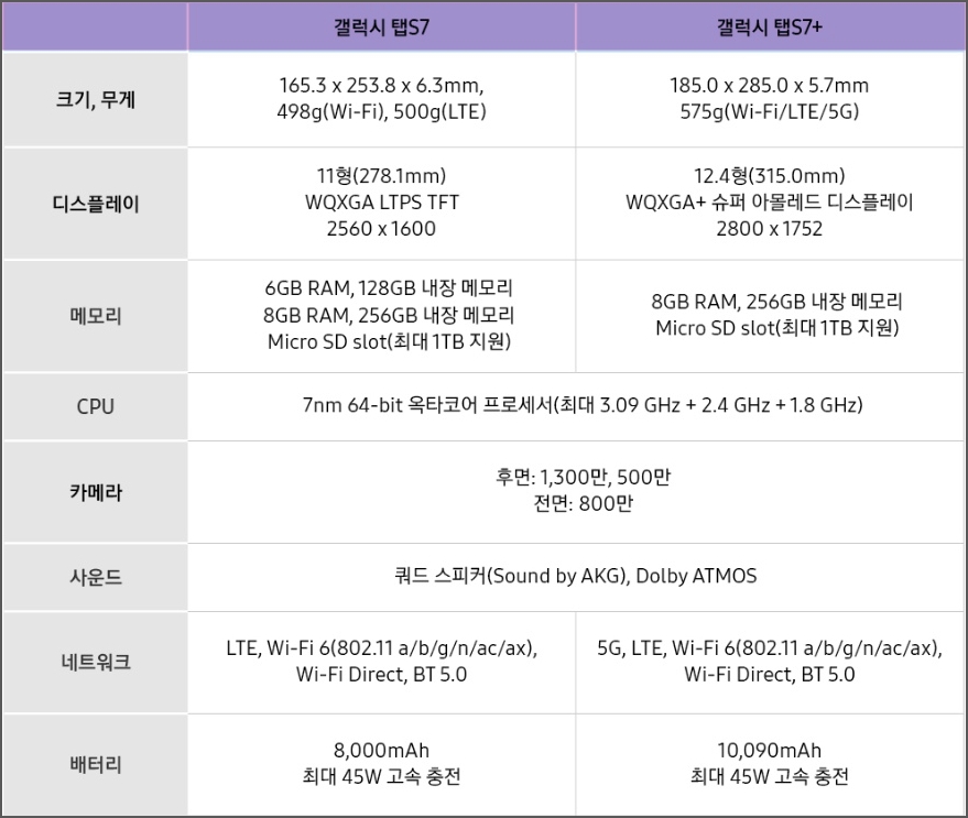 마지막으로, 갤럭시 탭S7과 S7+ 기기별 비교 입니다. 크기, 무게, 디스플레이, 메모리, 배터리 등이 차이가 있습니다. 비교해보시고 구매하시면 될듯 합니다. 아무래도 성능이야 S7+가 좋습니다만, 주머니 사정을 생각하지 않을 수 없네요.