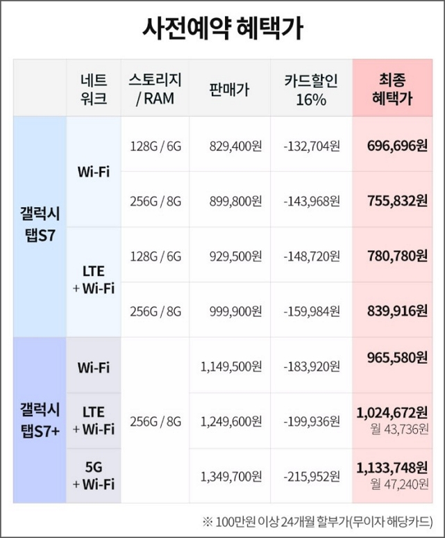 20%할인 시에는 S7+ LTE는 99만 9천 7백원, S7+ 와이파이는 91만 9천 6백원 정도가 됩니다. 18% 할인이 적용된다면 S7+ LTE는 102만 4천 6백원, S7+ 와이파이는 94만 2천 6백원 정도가 됩니다. 15% 이면 S7+ LTE는 106만 2천 2백원, S7+ 와이파이는 97만 7천 1백원 예상하면 됩니다.