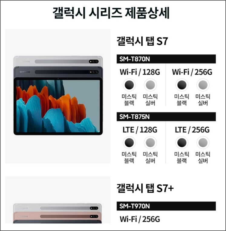 S7+는 미스틱 블랙, 미스틱 실버, 미스틱 브론즈 세가지 색상이 있습니다. 5G 제품은 미스틱 브론즈 색상 1개만 단독으로 나옵니다. 모두 8GB램과 256GB내장 메모리입니다. LTE, 와이파이, 5G 모델로 출시가 되며, 가격은 각각 124만 9천 6백원, 114만 9천 5백원, 134만 9천 7백원입니다.