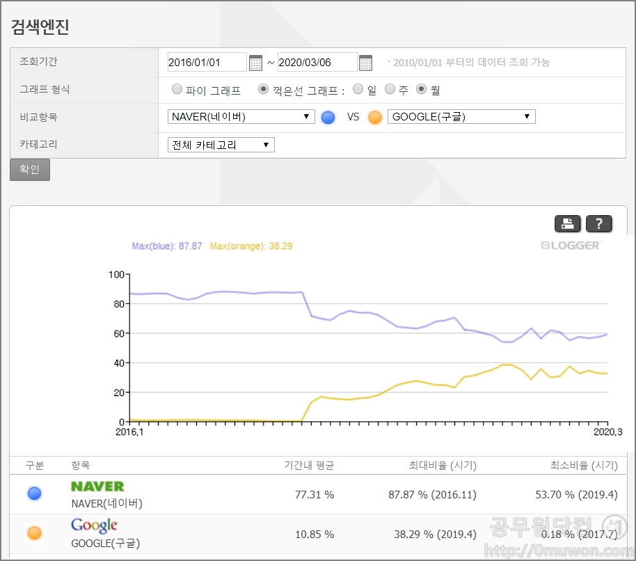 네이버 구글만 점유율을 비교해 봅니다. 네이버는 우하향, 구글은 우상향 중입니다. 앞으로 검색사이트의 점유율이 어떻게 될지 지켜봐야 겠습니다. 다른 나라처럼 구글이 1위를 하게 될지, 아니면 국내 검색사이트가 1위를 지켜낼지 궁금합니다.