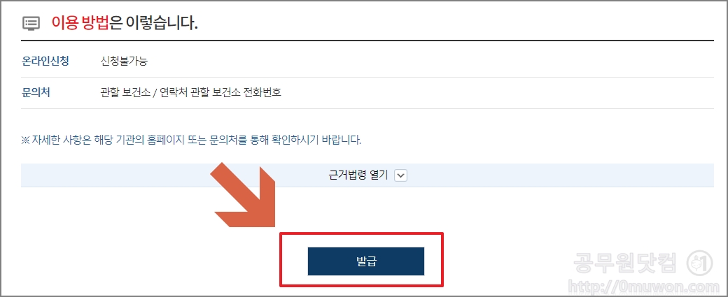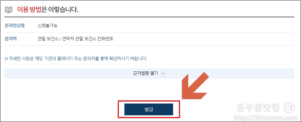 2. "발급" 을 클릭합니다. 발급이 되지 않는 경우에는 관할 보건소에 문의하시면 됩니다.