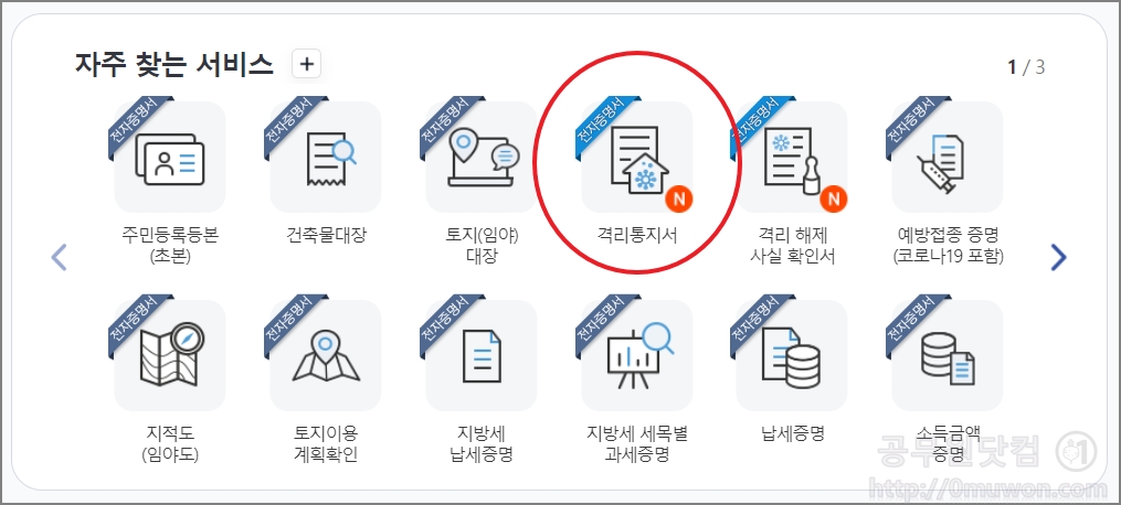 1. 정부24 홈페이지에서 "격리통지서"를 클릭합니다. 격리통지서에는 격리 확인을 목적으로 격리 시작일, 격리 종료일 등의 정보가 제공이 됩니다.