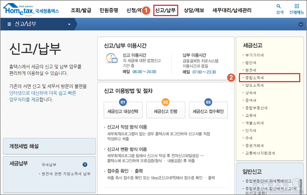 1. 홈택스에 접속을 합니다. 상단 "신고/납부" 메뉴를 클릭 후 "종합소득세"를 선택합니다. <홈택스 바로가기>