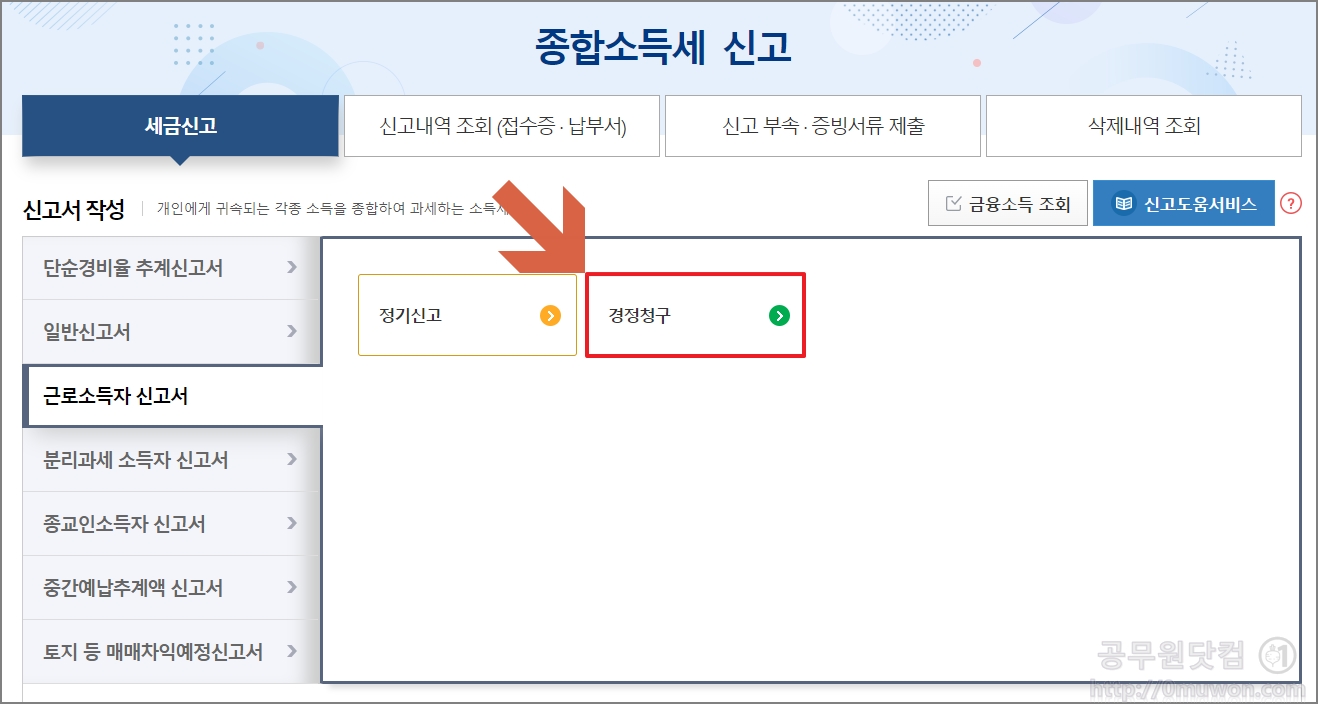 2. 종합소득세 신고 페이지에서 "근로소득자 신고서" 선택 후 "경정청구" 를 클릭합니다.