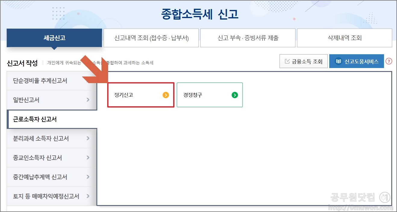 "종합소득세 신고 > 근로소득자 신고서 > 정기신고" 를 클릭합니다.