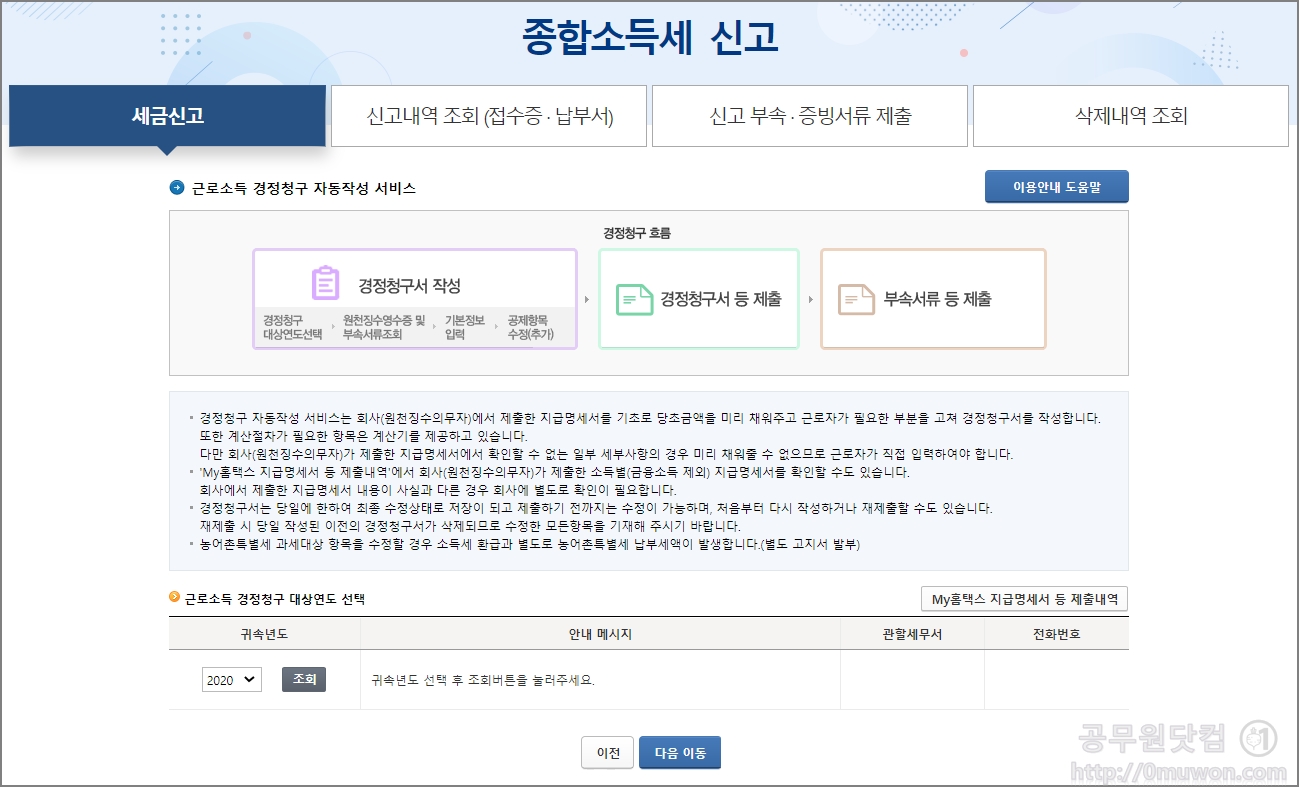2. 종합소득세 신고 페이지에서 "근로소득자 신고서" 선택 후 "경정청구" 를 클릭합니다.