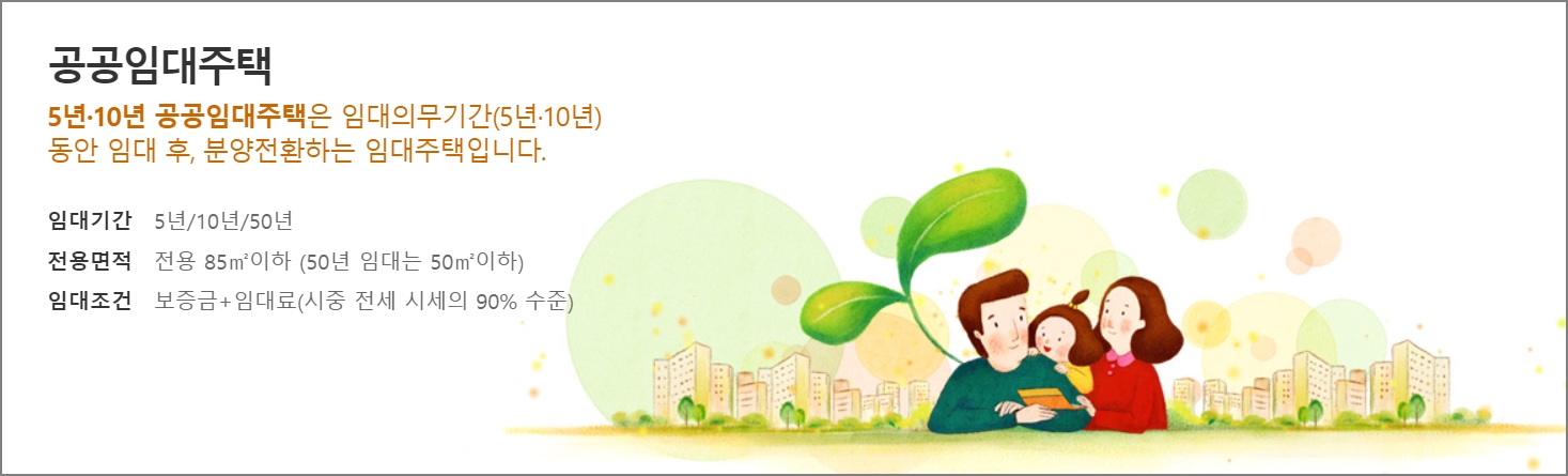 5년,10년 공공임대주택은 임대의무기간인 5년(10년)간 임대 후 분양 전환하여 입주자가 우선하여 소유권을 이전받을 수 있는 임대주택 입니다.