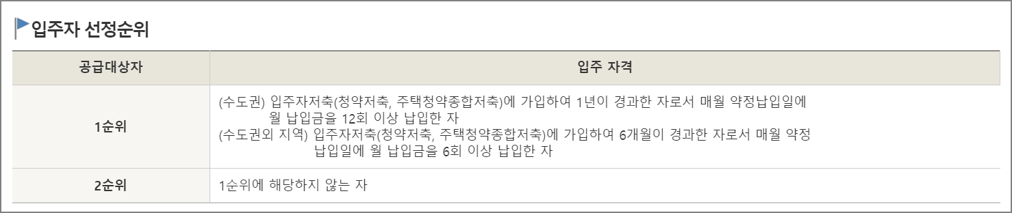 수도권은 주자저축(청약저축, 주택청약종합저축)에 가입하여 1년이 경과한 자로서 매월 약정납입일에 월 납입금을 12회 이상 납입한 분들입니다. 수도권이 아닌 경우는 입주자저축(청약저축, 주택청약종합저축)에 가입하여 6개월이 경과한 자로서 매월 약정납입일에 월 납입금을 6회 이상 납입한 사람들입니다.