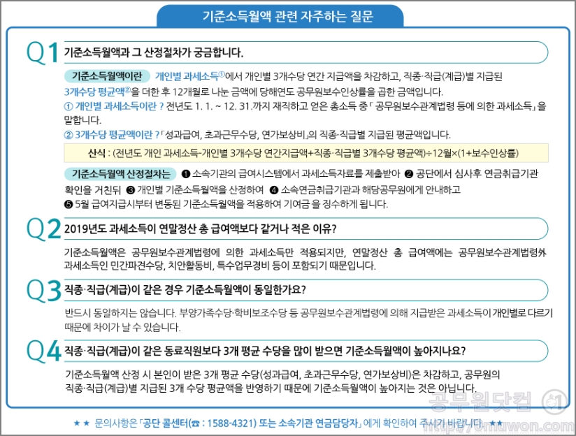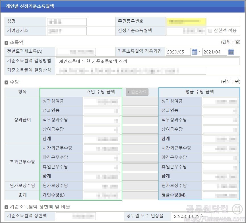 또한, 직종 직급이 같은 경우 기준소득월액이 다를 수 있습니다. 부양가족수당, 학비보조수당 등 공무원 보수 관계법령에 의해 지급받은 과세소득이 개인별로 다르기 때문에 차이가 날 수 있습니다.