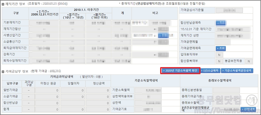 기여금납부 정보에 기분소득월액 확인 버튼을 클릭합니다.