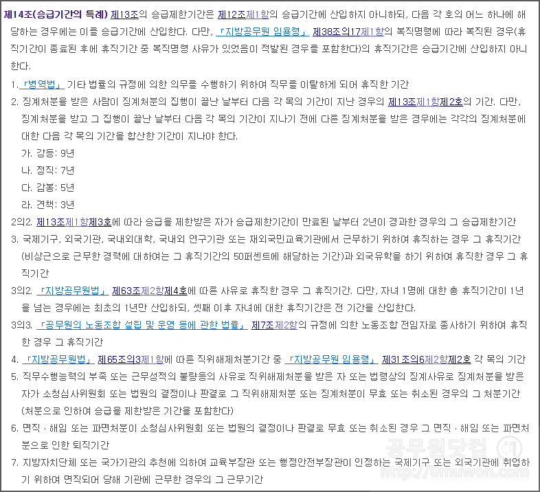 ① 승급의 제한기간은 승급기간의 특례(공무원보수규정 제15조, 지방공무원보수규정 제14조)에 해당하지 아니하는 한 그 제한기간 만큼 경력에서 감산합니다.