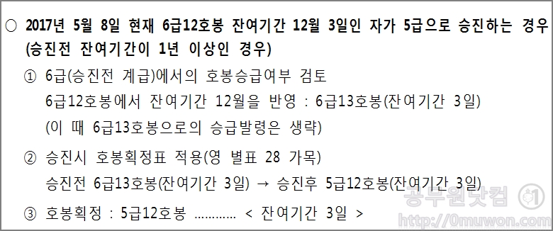2017년 5월 8일 현재 6급 12호봉 잔여기간 12월 3일인 자가 5급으로 승진하는 경우 승진 전 잔여기간이 1년 이상이므로 승진 전의 계급 6급에서 1호봉을 승급을 시킵니다.