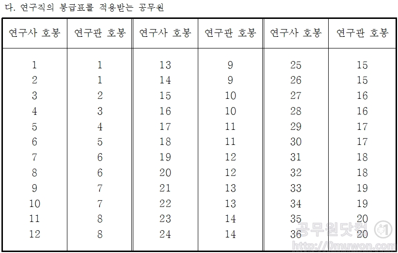3호봉, 6호봉, 9호봉 11호봉, 13호봉, 16호봉, 18호봉, 20호봉, 22호봉, 24호봉, 26호봉, 28호봉, 30호봉, 32호봉, 34호봉 및 36호봉에서 승진할 경우에는 승진된 계급에서 호봉을 획정한 후 잔여기간에 6월을 가산합니다. 기타 내용은 연구관과 동일합니다.
