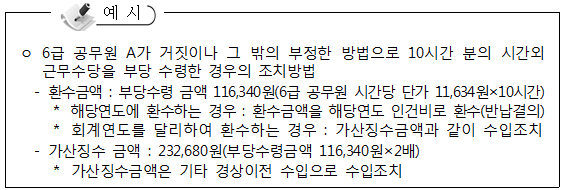 예를 들어, 2019년 6급 공무원 A가 거짓이나 그 밖의 부정한 방법으로 10시간 분의 시간외근무수당을 부당 수령한 경우에 환수금액 및 가산징수 금액을 알아보겠습니다. 6급 공무원 시간당 단가는 11,634원이므로, 부당수령 금액은 116,340원입니다. 해당연도에 환수하는 겨우에는 환수금액을 해당연도 인건비로 환수합니다. 회계연도가 다른 경우에는 가산징수금액과 같이 수입조치 합니다. 가산징수금액은 부당수령액의 2배이므로 232,680원입니다. 가산 징수금액은 기타 경상이전 수입으로 수입조치 합니다.
