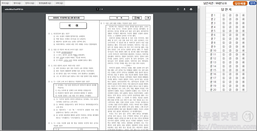 모든 과목의 문제를 다 푼다음 답안제출을 클릭하면 모의고사 시험은 종료가 됩니다. 온라인으로 문제를 풀면 자동으로 답안지가 제출이 됩니다. 점수도 바로 확인이 가능해집니다. 본인이 채점하지 않아도 됩니다.