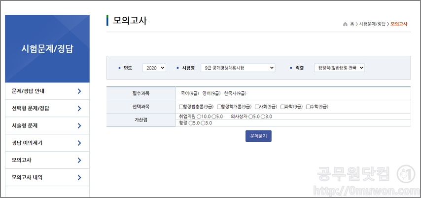시험에 따라 선택과목도 선택이 가능하며, 가산점 자격이 있으면 해당부분을 선택하면 됩니다. 문제풀기 클릭 후 모의고사를 실시하면 됩니다.