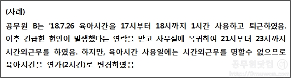 예를들어 육아시간을 17시부터 18시까지 1시간 사용 후 퇴근하였는데, 긴급한 현한으로 인해 21시부터 23시까지 사무실로 복귀하여 시간외근무를 한 경우. 육아시간을 연가로 변경하면 됩니다.