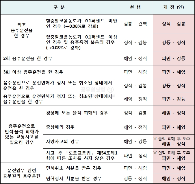 운전직공무원의 음주운전 처벌도 강화되었습니다. 운전직 공무원이 면허 취소를 당한 경우 해임~파면이며, 면허정지 일때는 정직~해임입니다. 면허정지 처분의 경우 1단계씩 상향되었습니다.