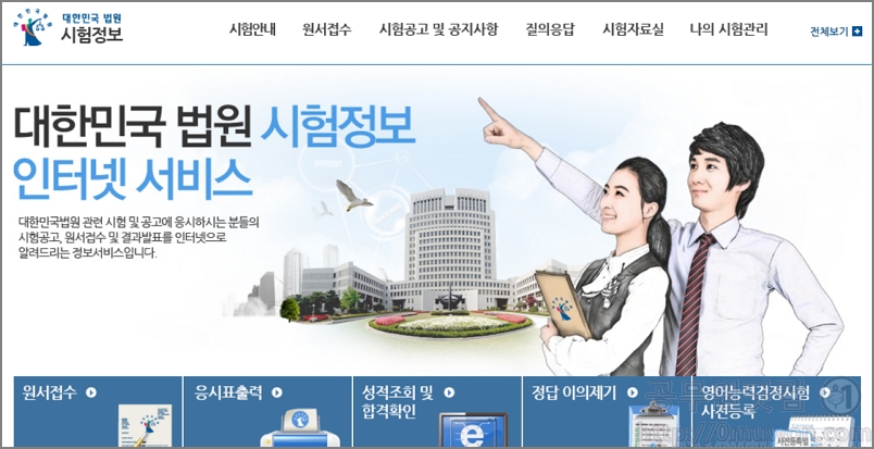 대한민국 법원 시험정보 인터넷 서비스입니다. 대한민국 법원 관련 시험 및 공고에 응시하는 분들의 시험공고, 원서접수 및 결과발표를 인터넷으로 알려드리는 정보서비스입니다. 법원직 공무원을 준비하는분들은 참고하세요. 그리고 법무사 시험정보도 확인 가능합니다. <법원 시험정보 사이트>
