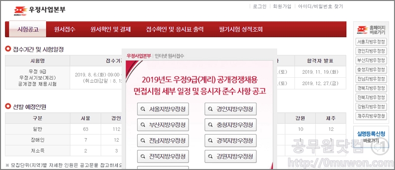 우정직, 계리직 원서접수 사이트 입니다. 우정직 공무원 접수기간 및 시험일정, 선발 예정인원과 채용정보를 한눈에 확인이 가능합니다. <우정사업본부 원서접수>