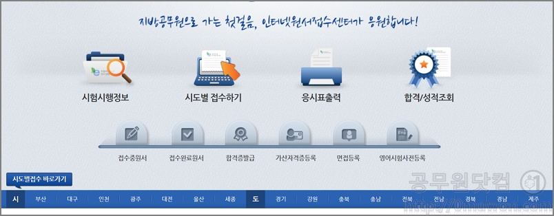 지방직 공무원 인터넷 원서접수 사이트입니다. 서울시를을 제외한 지방자치단체의 원서접수가 가능합니다. 시도별 접수 바로가기를 클릭하여 원하는 지역에 원수접수를 하면 됩니다. 부산, 대구, 인천, 광주, 대전, 울산, 세종, 경기, 강원, 충북, 충남, 전북, 전남, 경북, 경남, 제주 모두 가능합니다. <바로가기>