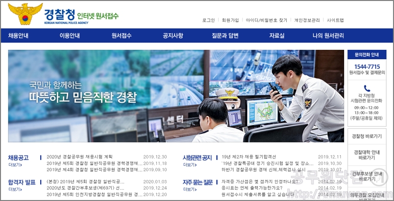 경찰공무원 인터넷 원서접수 사이트입니다. 경찰공무원 시험정보 확인도 가능합니다. 경찰공무원 시험과 관련된 원수접수 및 결재문의 등은 1544-7715로 하면 됩니다. <바로가기>