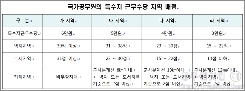 국가공무원의 경우 가지역은 6만원, 나지역은 5만원, 다지역은 4만원, 라지역은 3만원입니다. 백령도, 대청도, 소청도, 연평도 및 소연평도에서 근무하는 경찰공무원의 경우에는 3만원을 가산합니다.