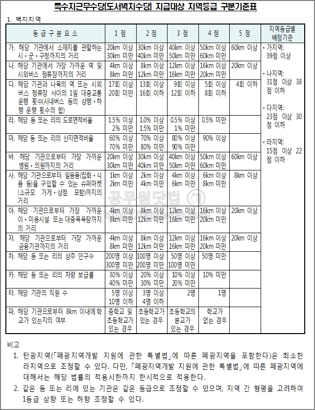 지급등급별 배점에 따라 지급액이 달라집니다. 크게 지역은 벽지지역, 도서지역, 접적지역이 있습니다. 지역등급별 배점기준에 따라 가지역~라지역 등급을 나눕니다.