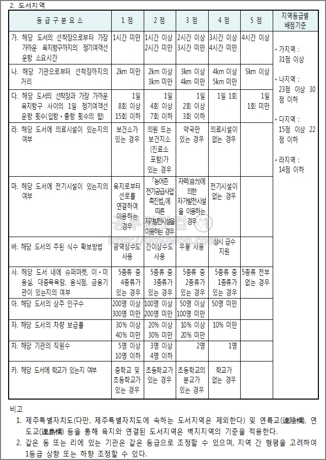 도서지역 가지역은 31점 이상, 나지역은 23점이상 30점 이하, 다지역은 15점이상 22점이하, 라지역은 14점 이하입니다. 도서지역은 일반적으로 섬지역을 말합니다. 다리가 있어 자동차로 갈 수 있는 지역은 도시지역이 아닙니다.